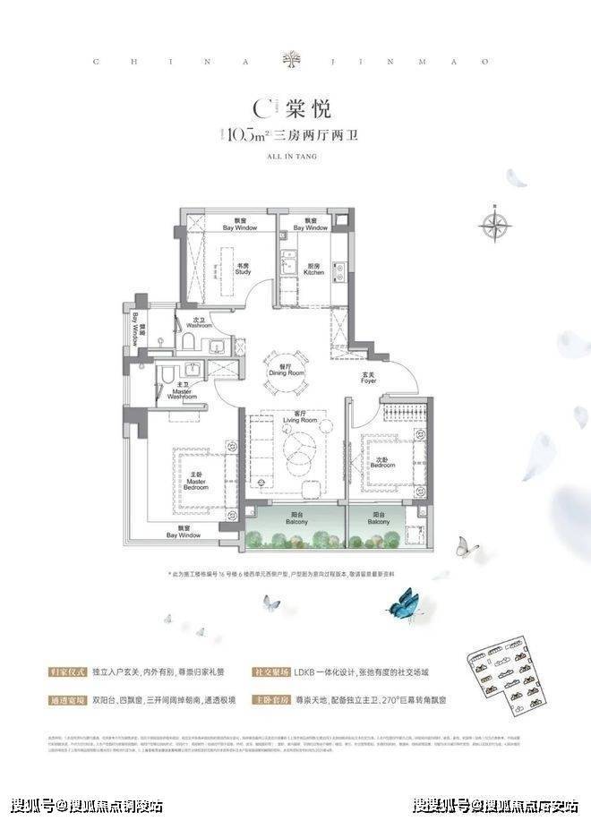 建面约105㎡3房2厅2卫,做到了三开间朝南4个飘窗+双面阳台系统+主卧套房设计+270°转角飘窗,该户型的居住体验、舒适度、尺度感,是同级别产品所无法比拟的。