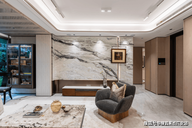 入户做了精致玄关柜,柜门为温润木饰面包裹,壁龛选用奢石映衬,质感非常棒。