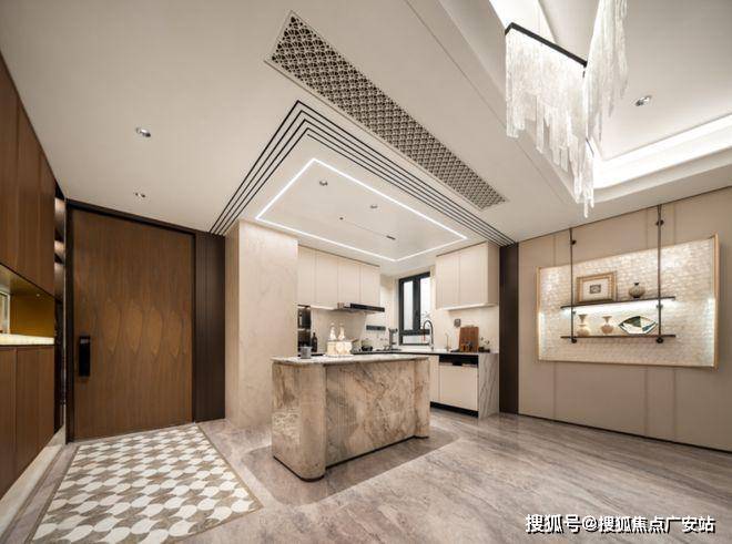 厨房方面,水波纹玻璃+金属造型玻璃移门,隐形上轨,厨房交付线性凉霸、末端饮水、博世或AEG(或同等品牌)烟灶、洗碗机三件套。