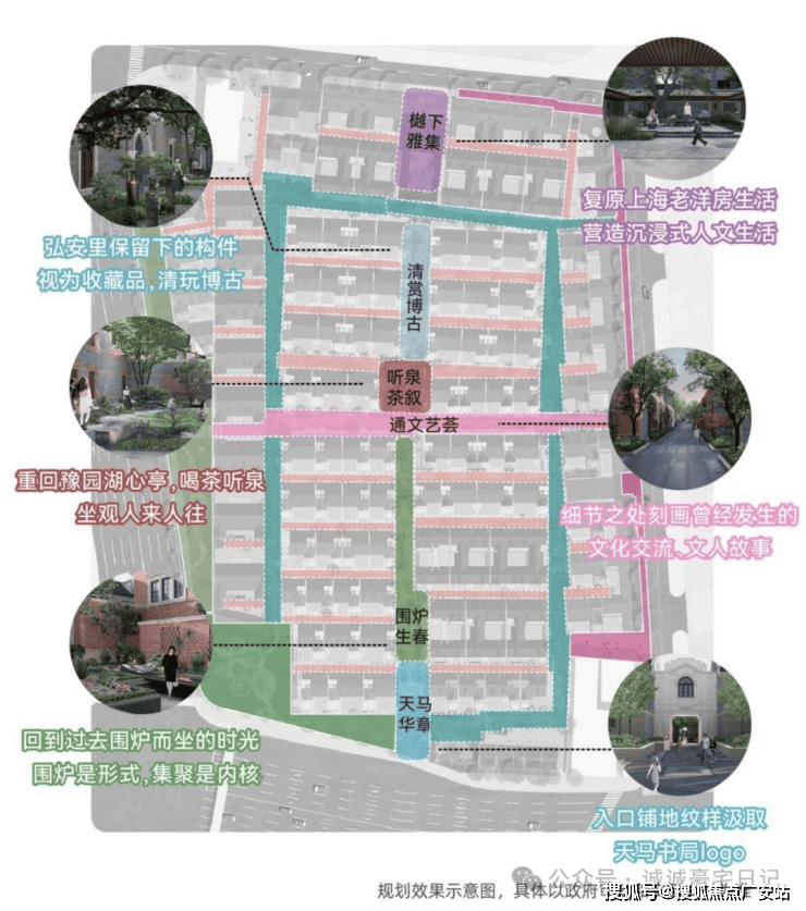 在社区的中轴上,弘安里植入记忆的符号与生活的画面,从入口处「天马华章」迈步前行,「围炉生春」「通文艺荟」「听泉茶叙」「清赏博古」贯穿到此次实景开放的「樾下雅集」,海派生活画卷昨日重现。