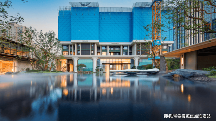 浮光池院水院会客厅,现已实景呈现,水景中央的艺术小品,如一滴水在湖面晕开,泛起阵阵涟漪。