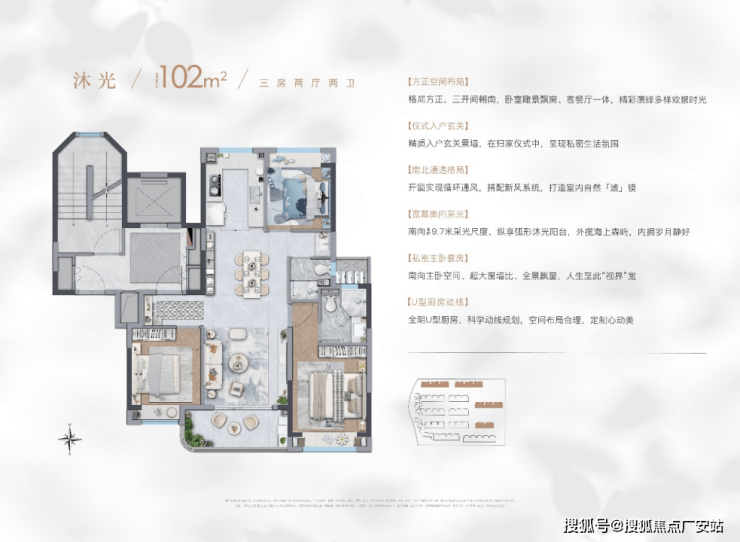 户型设计上,项目余少量102㎡三房户型,尺度匹配改善型的宽阔3房:全明的飞机户型,南北通透。三开间朝南+南向约9.7m的采光长度+主卧超大窗墙比+弧形沐光阳台等户型优势全部具备。
