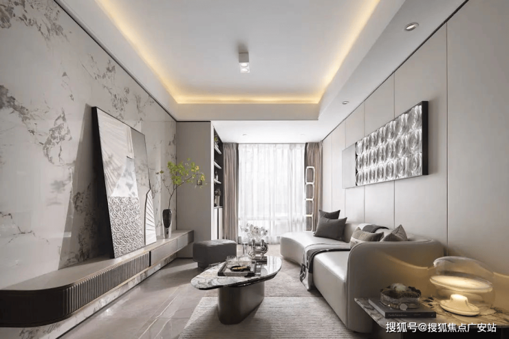 一心:是指建筑面积约1600㎡度假酒店中岛。中岛内拥有海岛风层叠水池、社交客厅以及庭院架空层,共鸣多样化松弛生活场景。