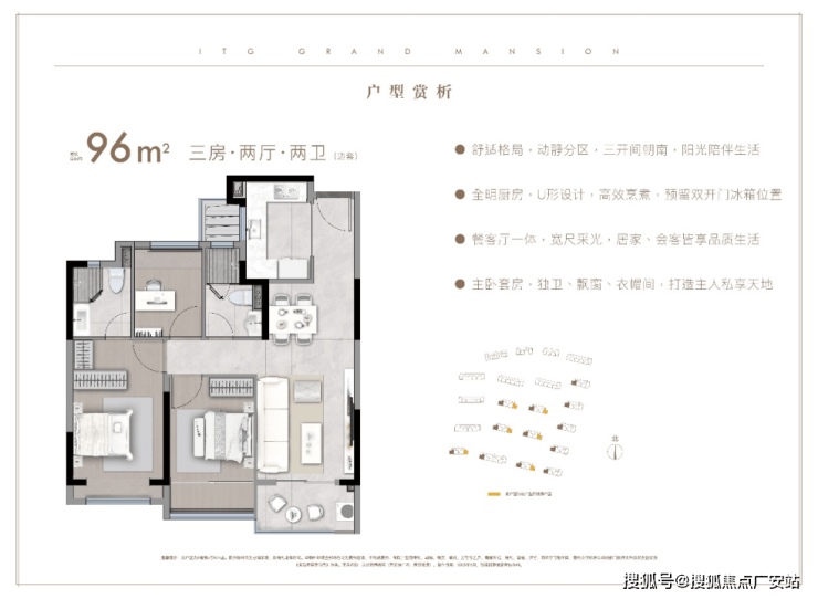 建面约96㎡户型三开间朝南,南向面宽达到约9米,双阳台双飘窗,主卧做到了约20平的全套房设计,整体户型全明且动静分离,可以说是一个难以挑剔的户型,也是客户关注度非常高的明星产品。