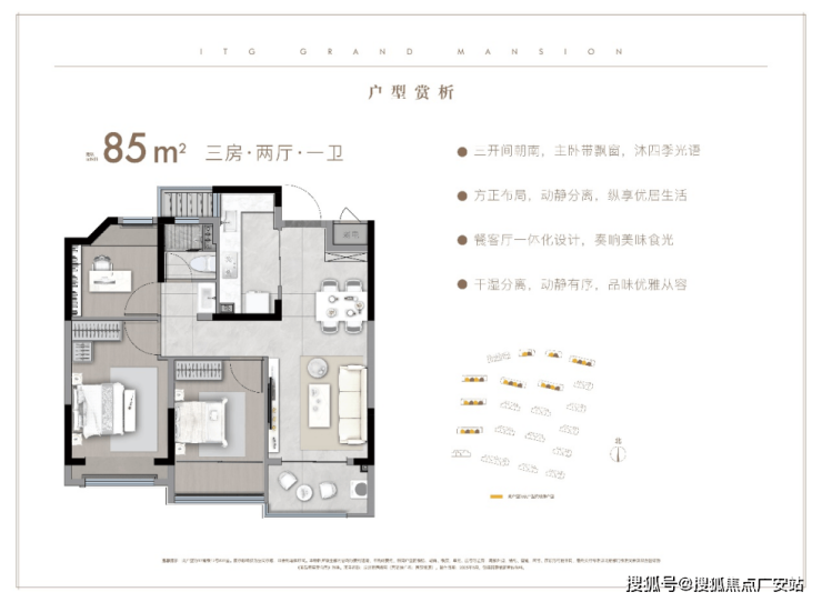 户型实用性强:85㎡三房功能齐全,三开间朝南,客厅阳台+次卧阳台+主卧飘窗设计,尽可能加大采光面