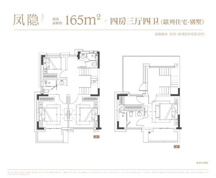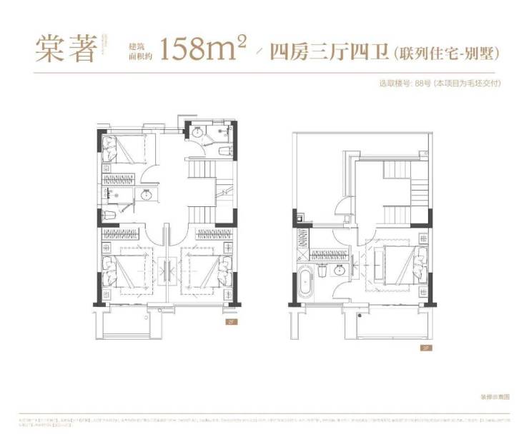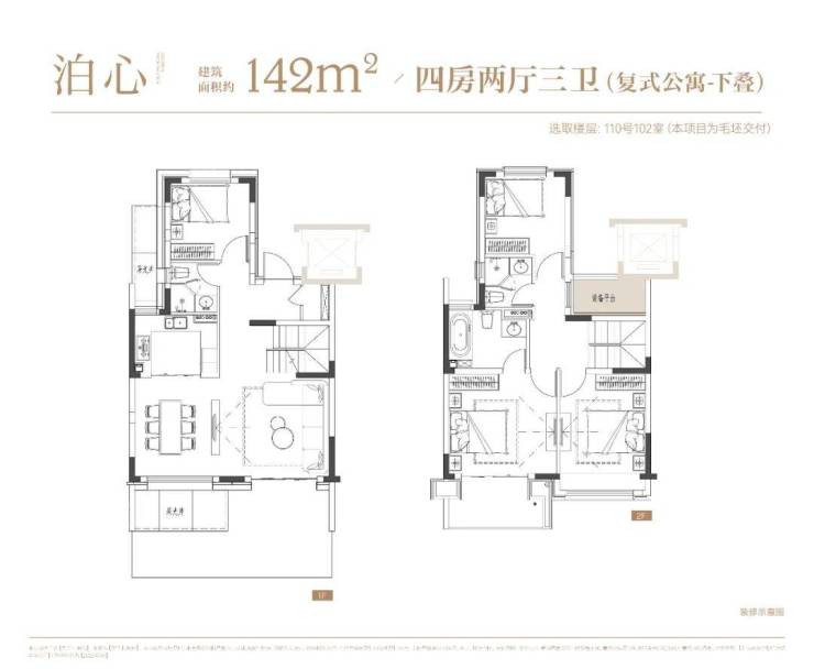 4层叠墅分为上/下叠,上叠建筑面积约139㎡,下叠建筑面积约142㎡,均为4房设计。