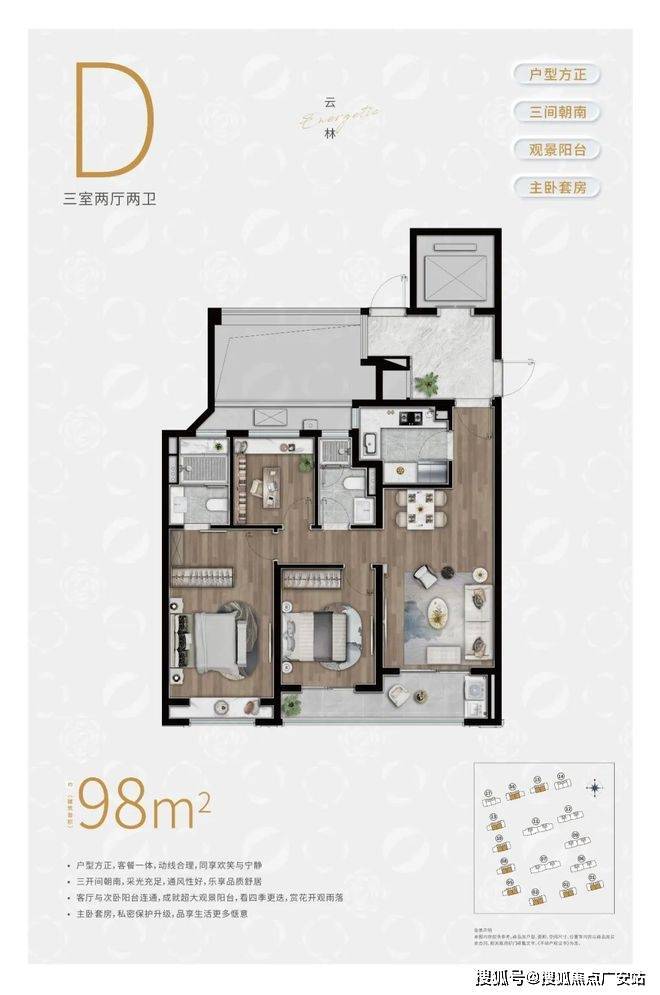 约98㎡3房2卫户型,三开间朝南,并且这贯穿客厅+次卧的超大阳台实在是惹眼,这个南向的视野延展度以及采光度相比同级别的户型来说,要更加出色。
