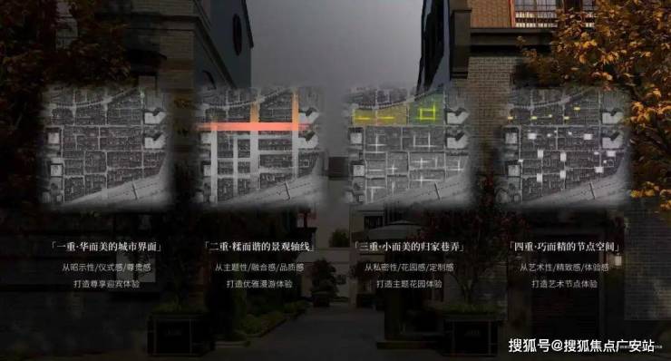 从城市界面到节点空间,由大到小打造“四重空间感受”,营造中西和鸣的感官体验。从华而美的城市道路、糅而谐的景观轴线,美而精的归家巷弄、雅而巧的节点空间,每一处场景皆实现私密与艺术的交融,感受城市繁华与归家宁静的交叠。
