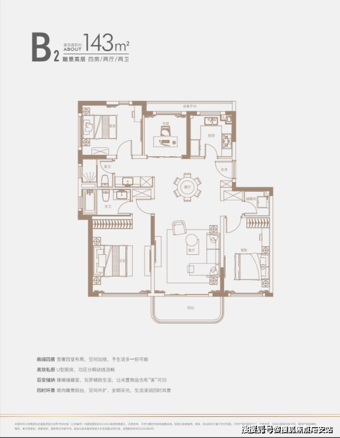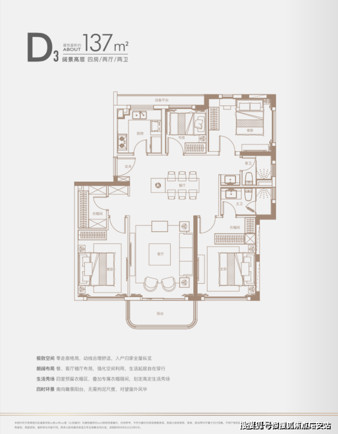 建面约140㎡四房:三开间朝南户型,南北通透,采光条件优质,客厅明亮宽敞,彰显大气布局。