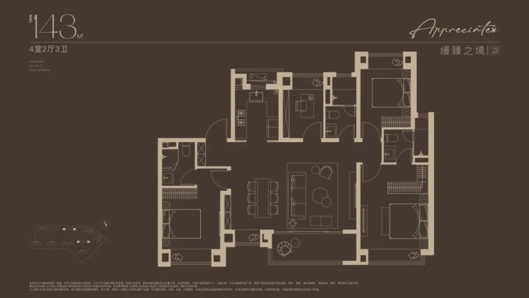 约143㎡4房2厅3卫:7.2米超大横厅,双套房,中西厨预留,适合二胎/三代同堂。