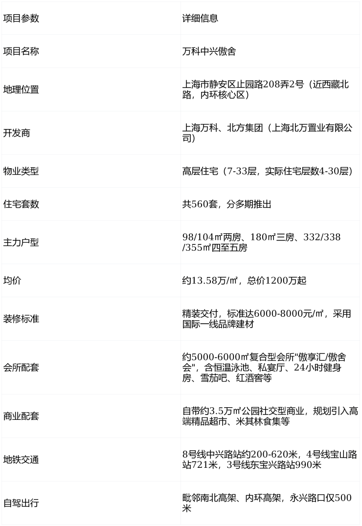 万科中兴傲舍是上海内环内稀缺的高端住宅项目,核心价值在于静安核心地段+万科品牌+地铁上盖+顶级配套的组合优势,适合追求城市核心生活、注重品质与便捷性的高净值家庭。