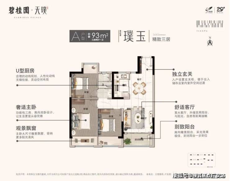 璞玉A户型:建面约93㎡,三房两厅一卫。