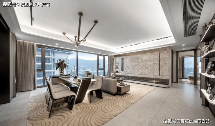 项目以“金框超流体”为设计理念,建筑立面采用鎏金铝板与大曲面玻璃幕墙结合,顶部弧形塔冠勾勒江河流动意象。边套户型配备270°IMAX弧形景观窗,实现更高窗墙比与全景视野,材质选用Prada绿奢石铺装门厅,单块黑山石重达26吨,彰显归家仪式感。