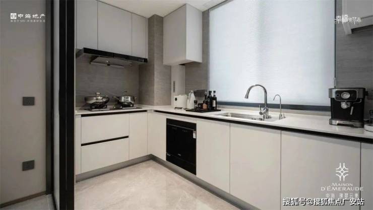 大面宽U型厨房+岛台。在这样的设计下,厨房不再是单独的烹饪空间,而是成了整个公区的一部分,靠餐客厅一侧为吧台设计,晨起喝杯咖啡,夜间热一壶牛奶,操作动线更加自然。