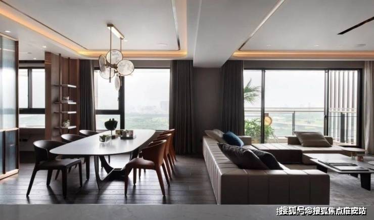 ▲餐厅旁边是书房空间,以长虹玻璃推拉门作为隔断,在金属边框的设计下,与餐厅的吊灯形成呼应,门两侧是木饰面+吊架书架的设计,也是显得简约华丽而高级.