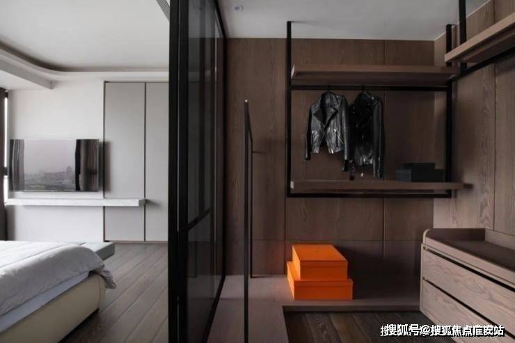 ▲玻璃隔断后的衣帽间,整体以木饰面为墙面背景,让空间更加干净而温馨;开放式的衣帽架设计为主,提供了一个方便灵活的衣物收纳存放位置,布置抽屉也是让小件物品更加方便存放与取用.