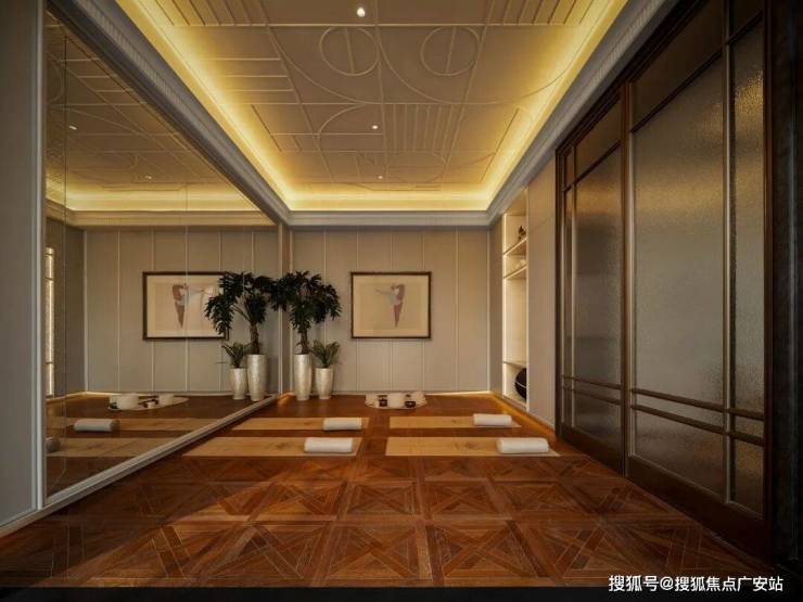 轻法式风格高定瑜伽室,镜面雕刻暗藏巧思,以现代化手法演绎ARTDECO图形元素,延续健身空间美学。