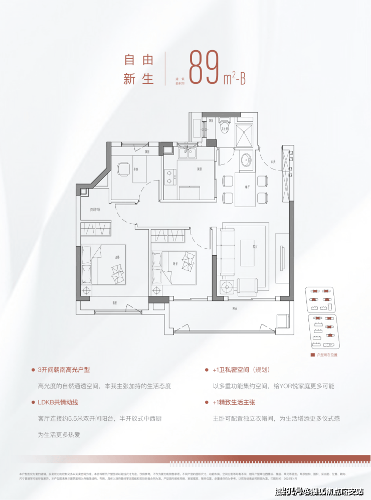 不同于一般的三房把这个小房间直接做了主卫,这个项目把选择权留给了购房者,并在下方铺设了上下水管、相当人性化!除了以上亮点之外,这个户型还有惊喜小细节.为了解决爱买买买的年轻人收纳痛点,户型设计上保留了厨房最大的收纳空间,可以打双组吊柜.在主卧和次卧都预留了收纳柜的位置.除了三开间朝南的经典户型,89m²还做了三面通风的户型.