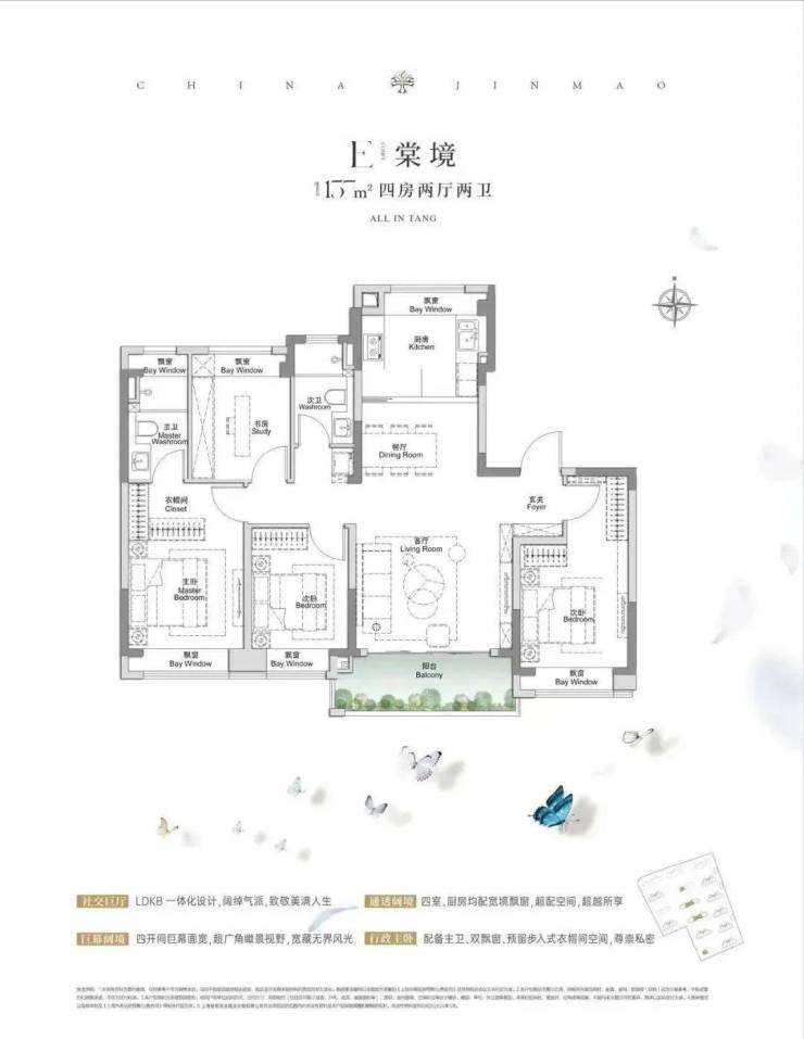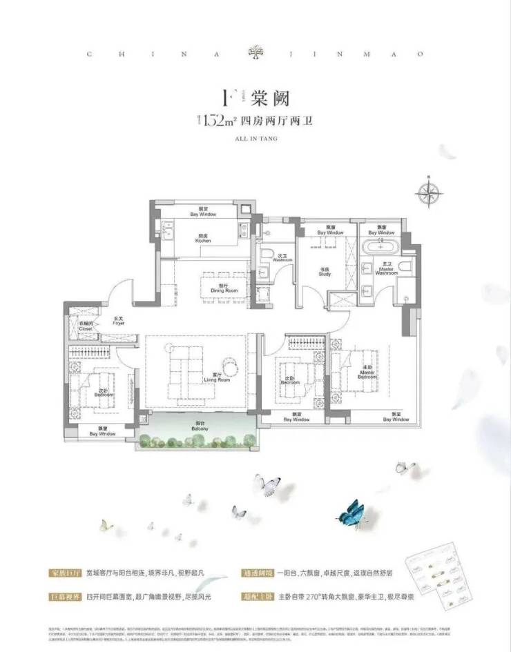 建面约117㎡3房2厅2卫,做到了3+1开间朝南+5个飘窗+主卧套房设计+270°转角飘窗,所有的尺度都有进一步提升。