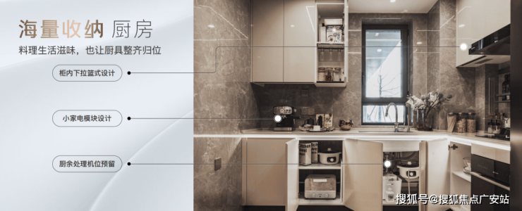橱柜收纳系统:特别预置洗碗机、柜内下拉篮式设计、不锈钢挡油板、柜下操作灯、烹饪全流程功能动线一体化设计;