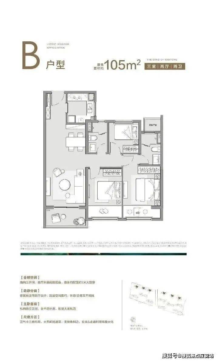 三开间朝南,客厅外展尺度阳台,采光丰富;餐客厅竖向联厅设计,动线空间集约,生活互不干扰。