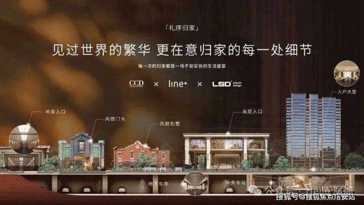 1)高奢入口:天际云邸的高层礼仪入户,设计灵感源于英国百年文化地标伦敦的怀特利,穿越百年骑楼风华,进入摩登大堂,过去与现在,国际与东方,精致摩登,在这里交相辉映。