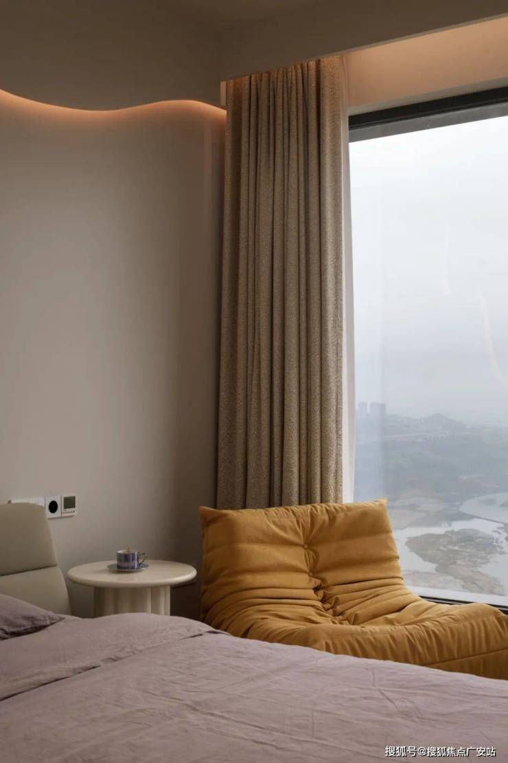 主卧延续着精致简约的基调,粗粝质地中藏着精密尺寸的计算,其纹理背后亦可感知到匠心工艺。在优越的山河景观之中,所有浮躁都会渐渐淡去。