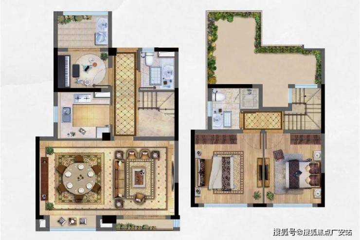 上下两层,动静分离,生活功能分区明显。一层餐客厅一体,二层休憩区,还有大面积露台,打造恬静花园,生活舒适且美好。