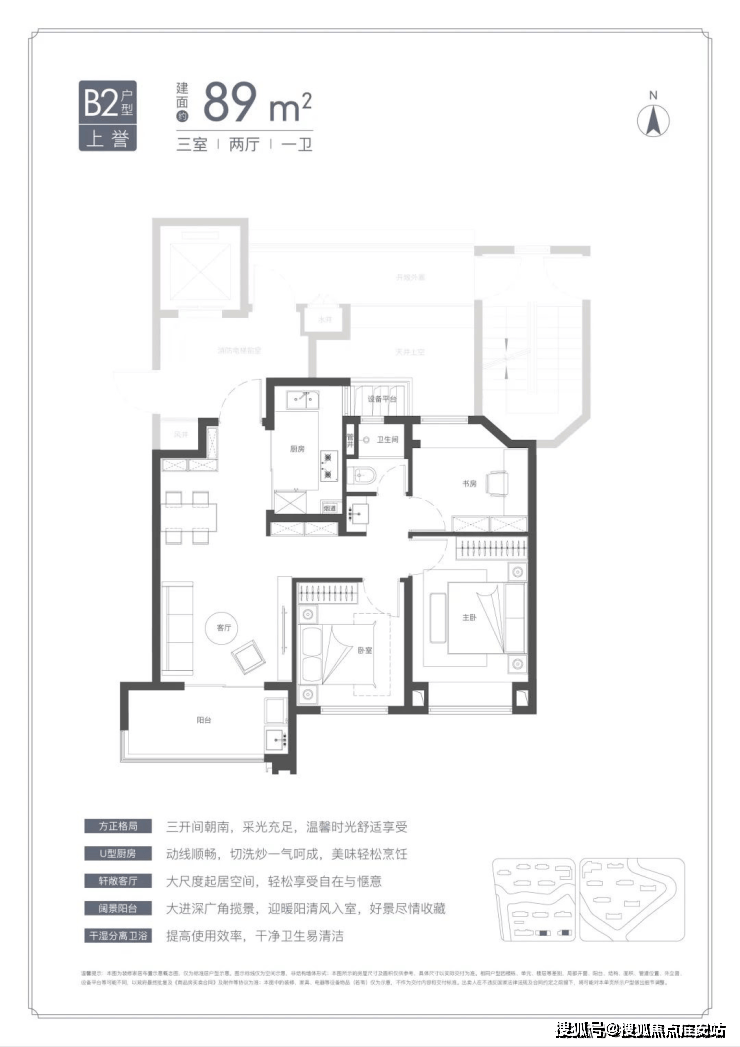 U型厨房、餐厅、客厅、阳台一线联通,南北通透。主卧套房、全卧飘窗、次卫干湿分离也都是标配。