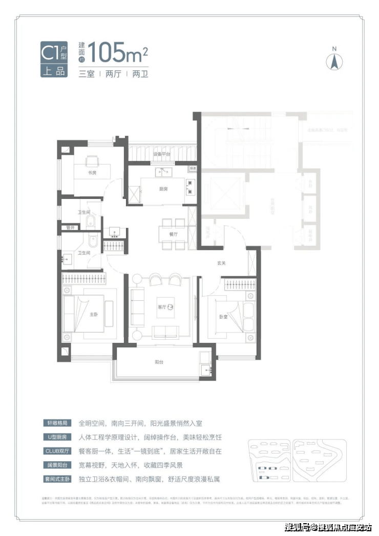 罕见宽厅设计:约95%的宽厅设计出现在120㎡以上户型中,而项目在约105㎡面积段就做了宽厅,非常难得,这个户型进入二手房市场将极具竞争力。