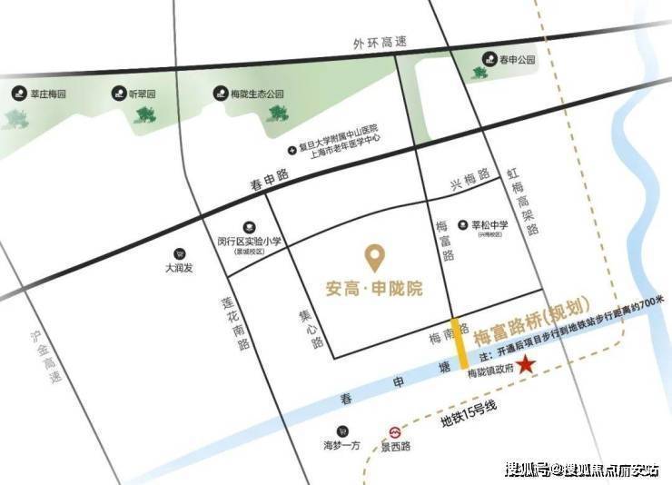 「安高申陇院」距离15号线景西路站直线距离仅约500米(来源于百度地图测距),未来春申塘建桥后,将迅速抵达地铁站,通达全程!