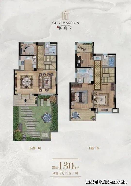 下叠:1-2层 130平,有花园和地下室