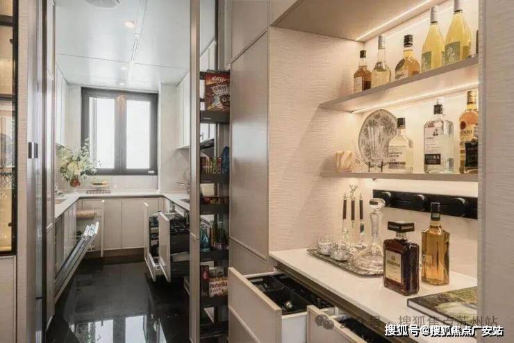 当下比较热门的横厅布局,横厅尺度达6.1米,层高3.15米,同样尺度奢阔。想象一下,家庭小型聚会,一边在大横厅里面和朋友畅聊,一边给友人煮咖啡或烤面包,生活场景丰富多姿。