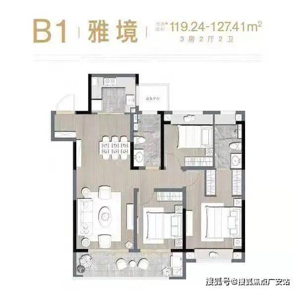 这款约122㎡是大三房设计,户型方正,三开间朝南,次卧与客厅共享双联阳台,主卧与北次卧带飘窗。