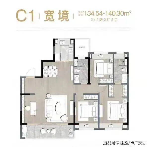 3+1房设计,双开间大阳台,尺度感爆棚,全天采光和日照不在话下;卧室均带有飘窗,空间得到延展。