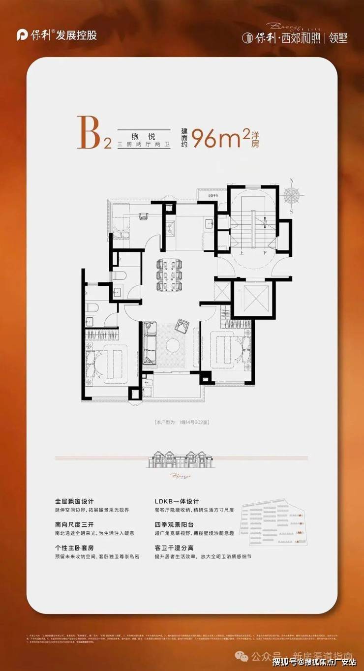 建面约96㎡的 洋房户型,以三房两卫的全能格局。LDKB 一体化设计,打破空间边界,让餐客厅与阳台流畅相连,成为家庭互动、宴请宾客的活力场域 。全屋飘窗延展空间,引阳光与风景入室,三开间朝南、南北通透。北向多功能间,附带270°广角视界,让每一寸生活都浸润在风景里。主卧套房预留收纳空间,给予主人私密尊崇。从起居到观景,从社交到休憩,全方位适配品质生活需求,是洋房里的理想栖居范本 。