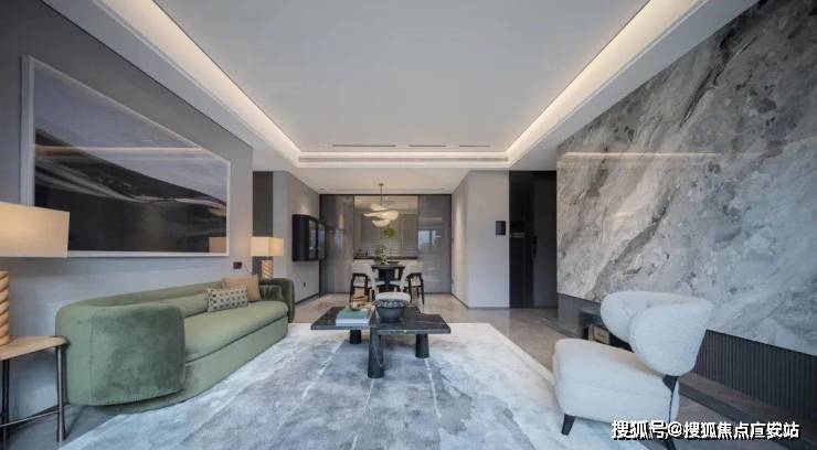 同时,电视背景墙也是一整块西西里翡翠岩板,还有申请了国家专利的东方云纹岩板,建面约238㎡更是整块玉石(原石材),全苏州仅此一家!