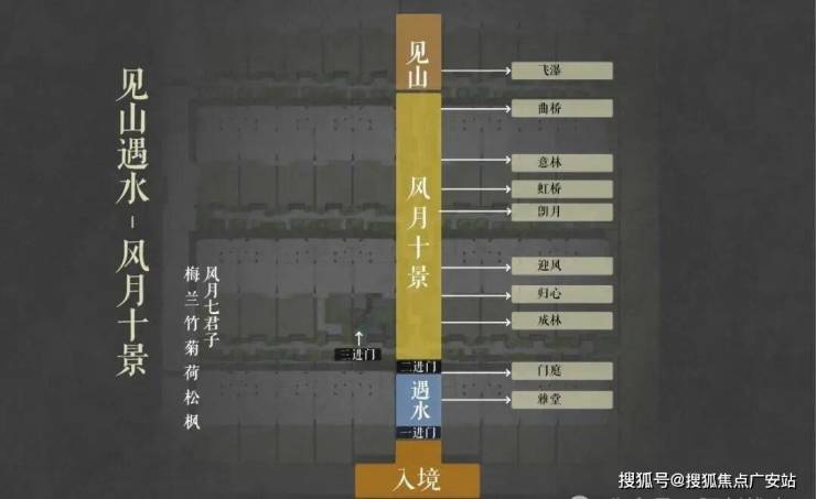 中国人自古讲究归家礼序,门第之尊;久映颂月将传统中式建筑的礼序空间融入整体的规划布局中,形成一坊八巷-置坊入巷-穿巷入户的三重归家礼序。