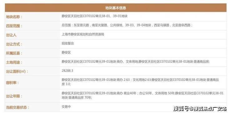 2020年10月,仁恒+华发联合体以42.1亿的价格竞得静安区天目社区,C070102单元38-01、39-01地块,溢价率为1.25%,成交楼面价52833.79元/㎡!