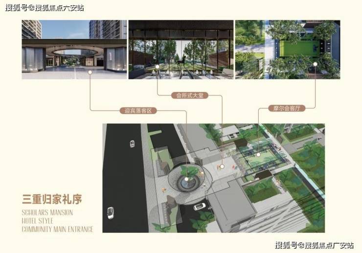 三重礼序 尊崇归家之路汲取四季酒店设计精髓,于社区主入口打造豪华酒店大堂式归家设计,以迎宾落客区--会 所式大堂--摩尔会客厅的渐进式排布,勾勒出入境--入画--归影的三重归家仪制。