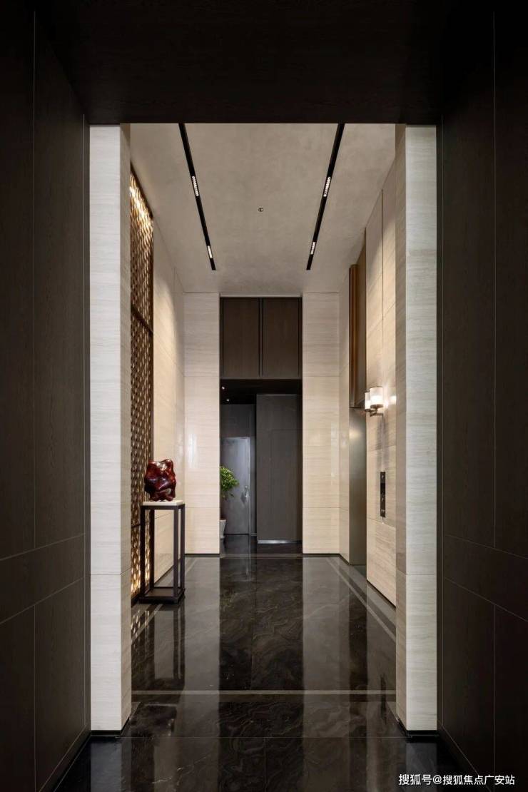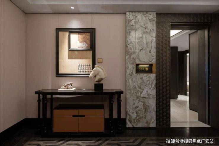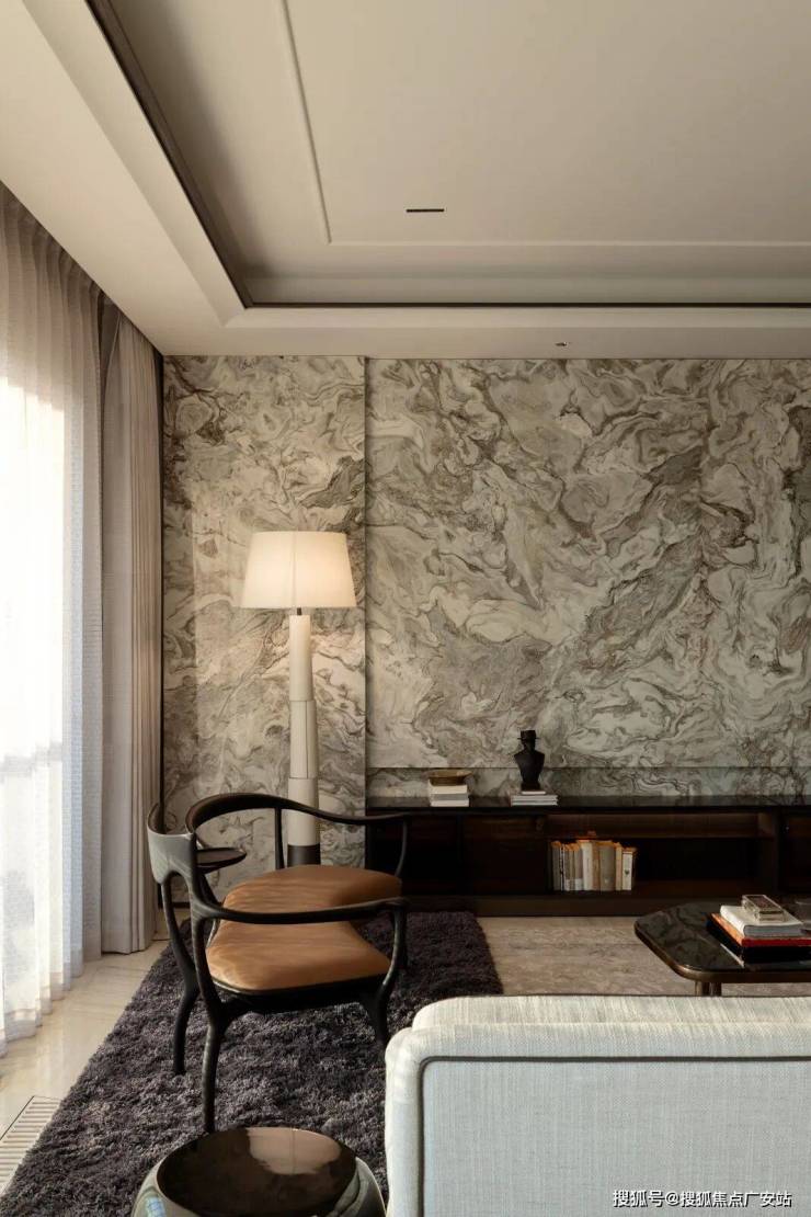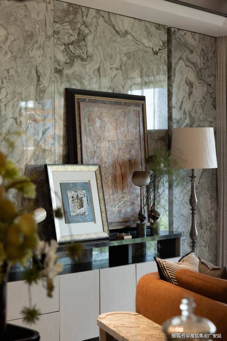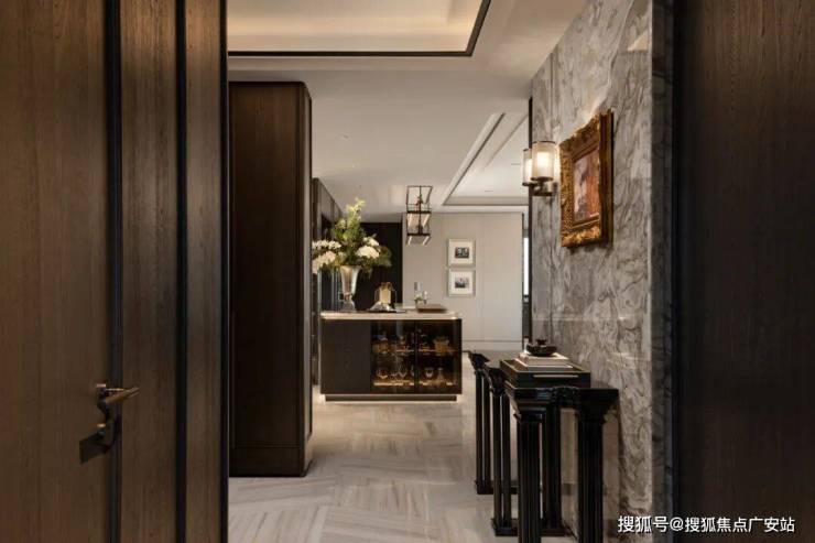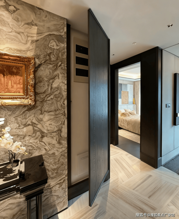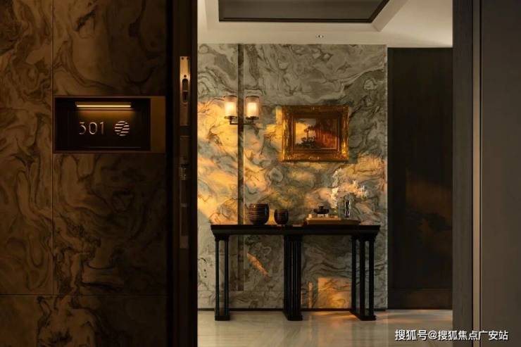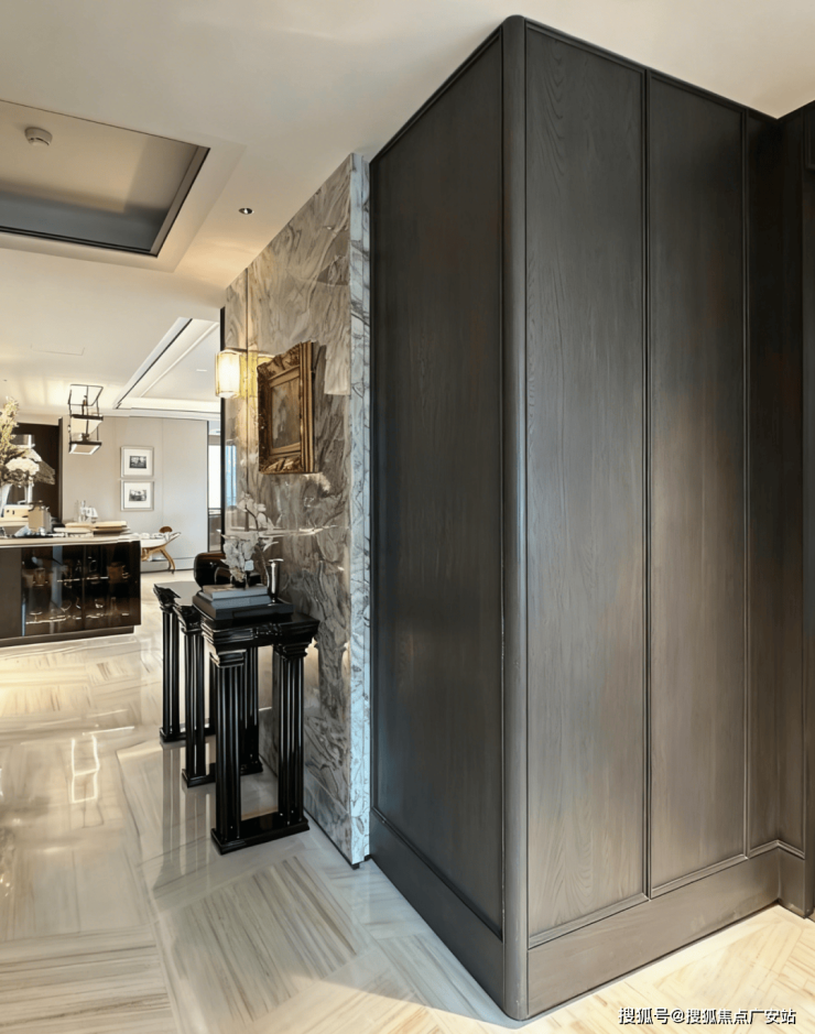 如西湖冬雪与钱塘潮涌,浑然天成的石材艺术背景墙,定格了大宅门厅的奢雅气韵。