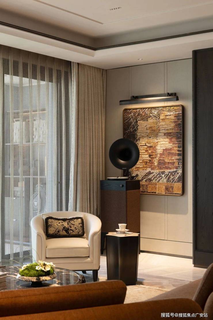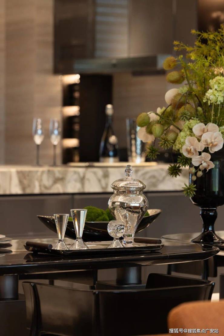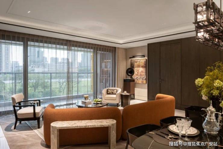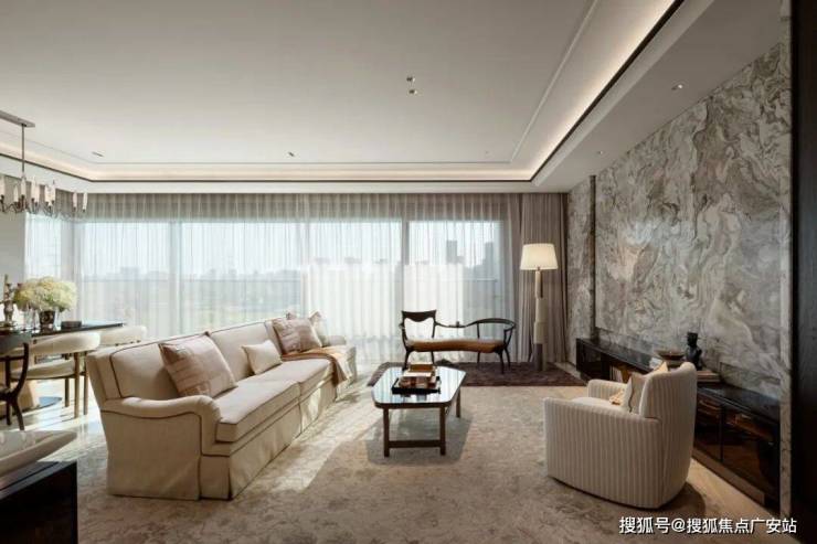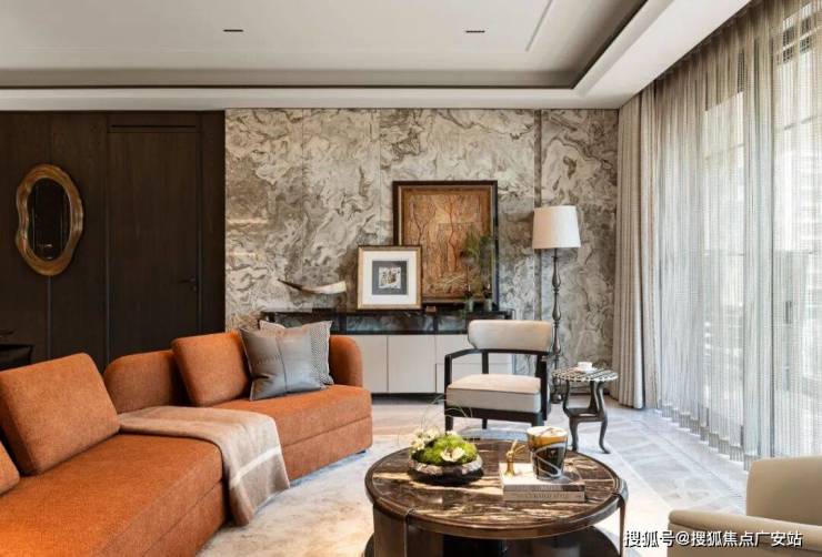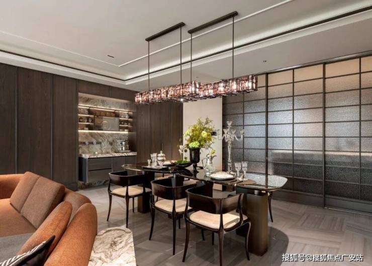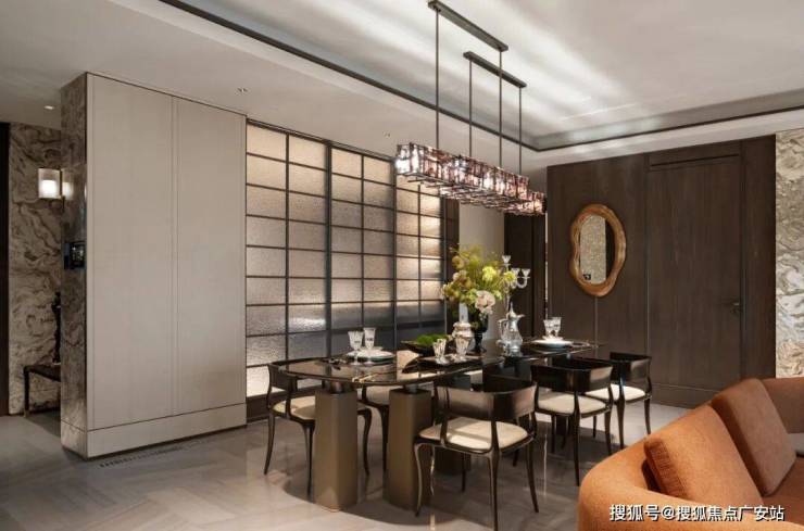 沉稳的深色木饰面、经典的水纹玻璃隔断,搭配纹理飘逸朦胧的大理石,构成这次样板房设计的主要视觉元素。在 “繁” 与 “简” 之间,设计师将现代和古典元素信手拈来,营造出丰富而兼具优雅复古质感的轻奢格调。