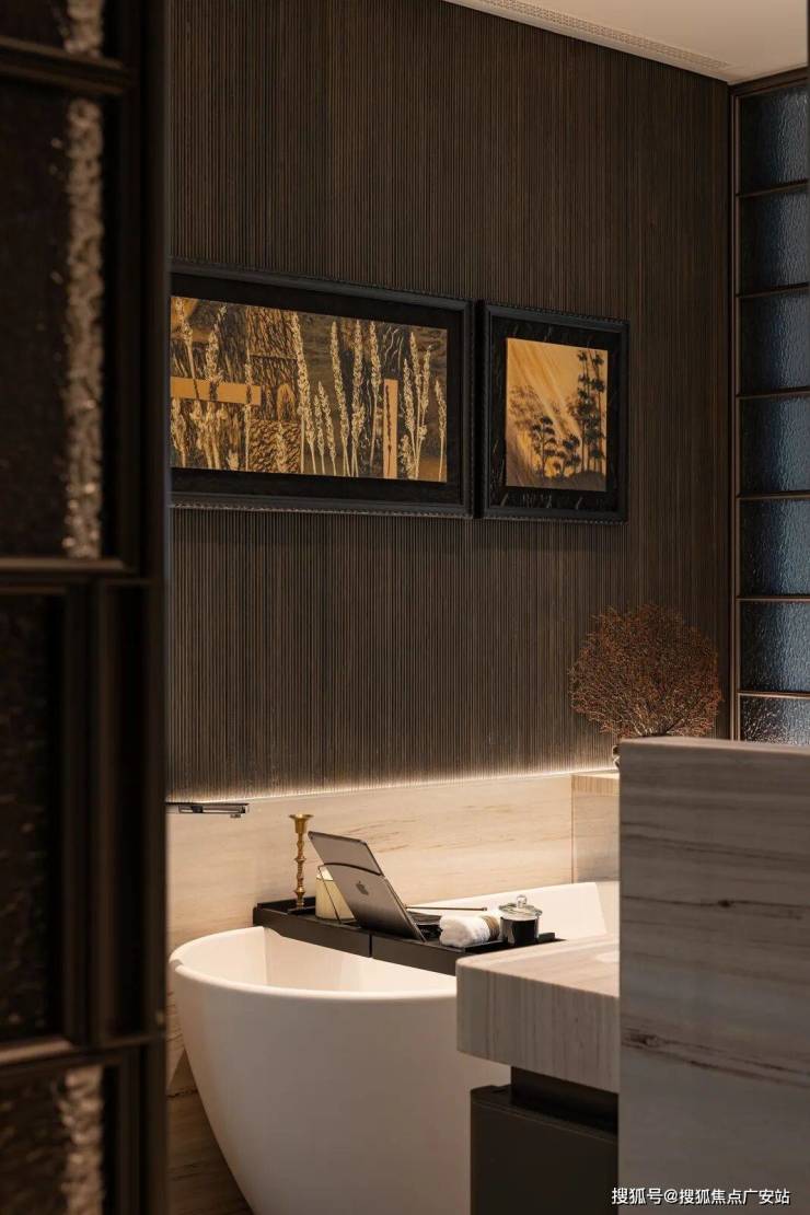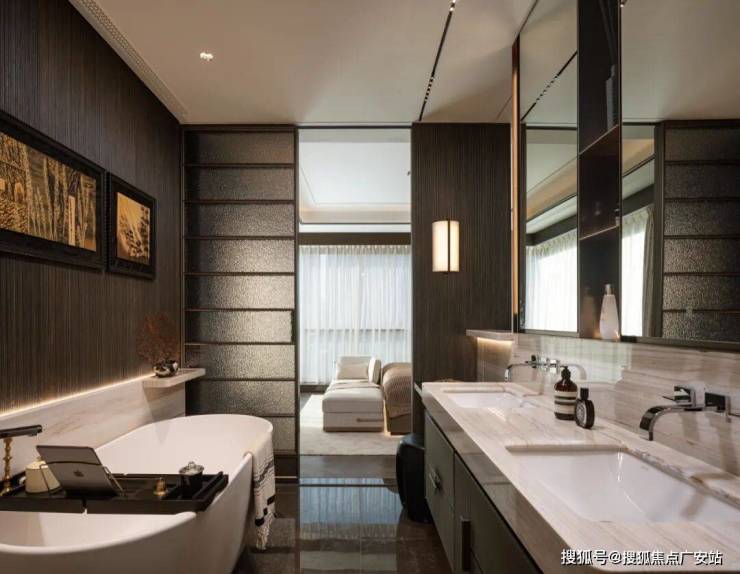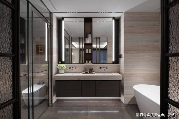超大主卫集独立浴缸、双台盆、淋浴间于一体,搭配纹理石材与复古玻璃屏风,营造出酒店行政套房般的奢雅氛围,让居者在家即可享受沉浸式高端卫浴体验。