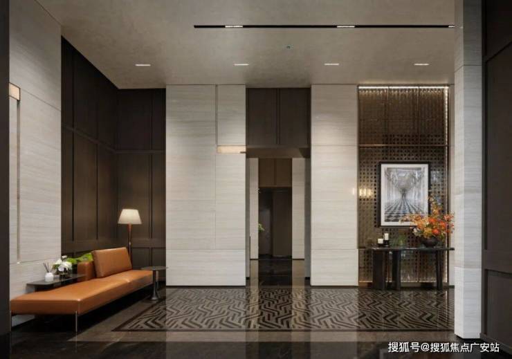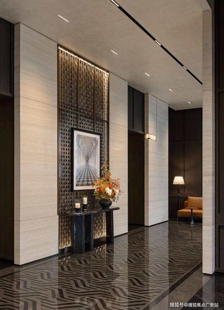 酒店式归家大堂以温润的材质语言,构筑起内外过渡的优雅序厅。浅色石材与金属格栅勾勒出精致的视觉韵律,而地面拼花、墙面分割与利落的天花造型,在开敞格局中巧妙融入细节,营造远观大气、近览有致的空间印象。