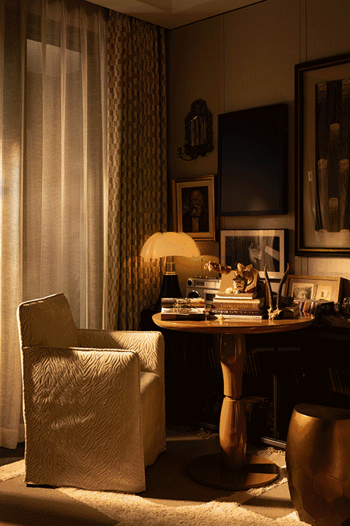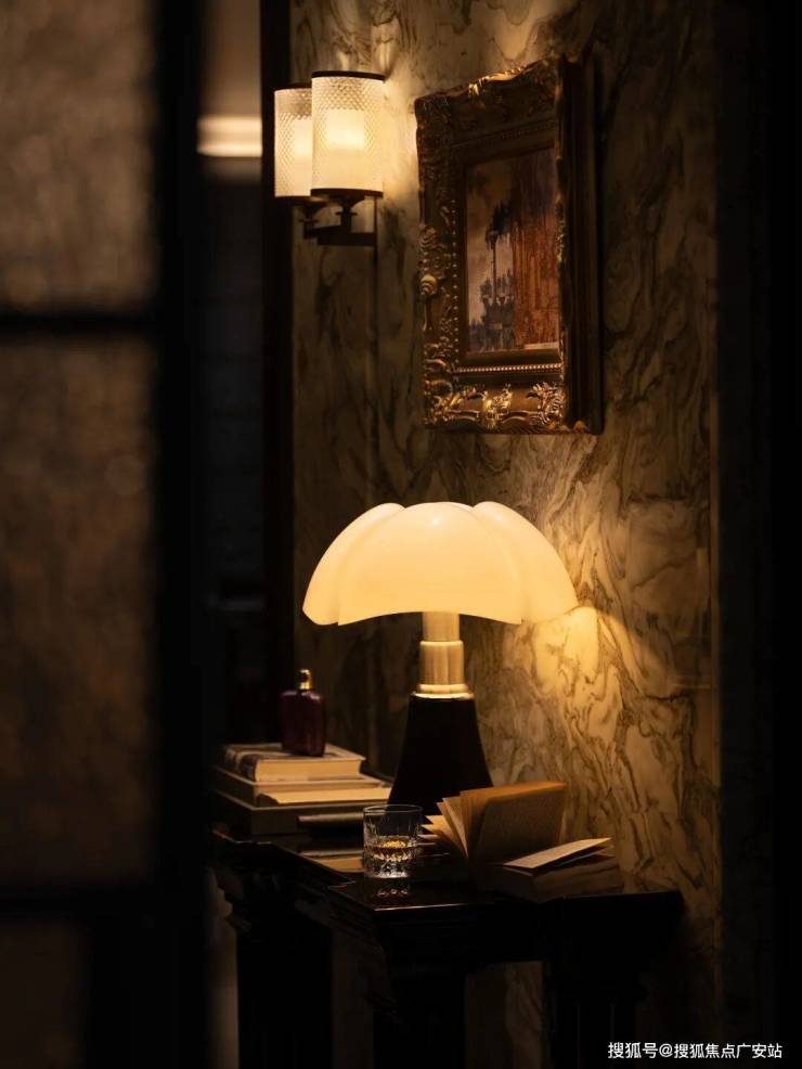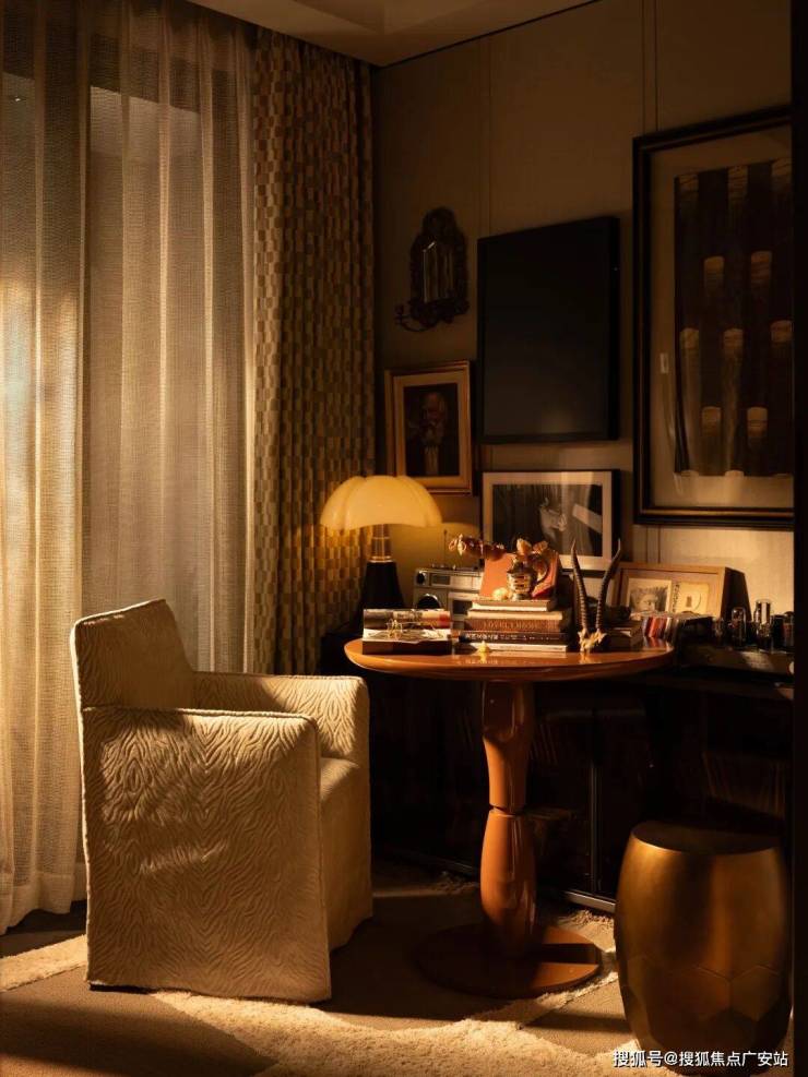 暖橘色沙发、鎏金框挂镜与点亮的琥珀色灯光,共同谱写了一曲复古与优雅的视觉乐章。