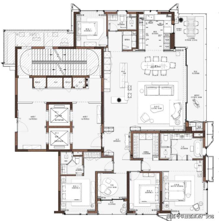 270户型是一个4+1的配置,四个卧室加一个多功能书房,双套房设计。其中主卧以超五星级酒店行政套房标准打造,在居住仪式感与舒适性的平衡上实现突破。