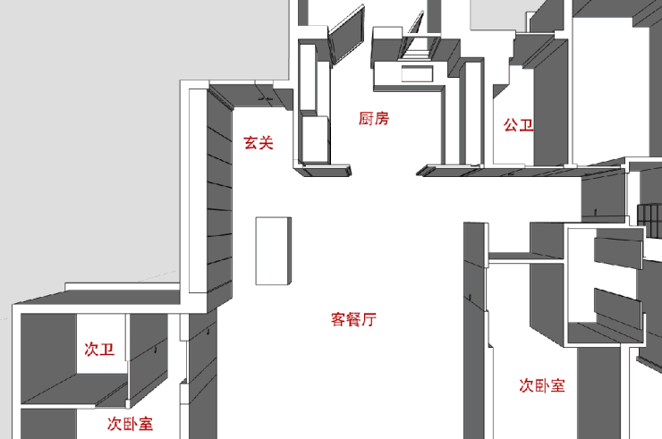 玄关左侧的墙面外凸,既强化了玄关的空间围合感,又为厨房推拉门提供了完全隐藏的条件。