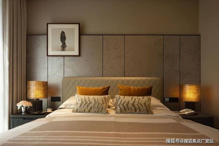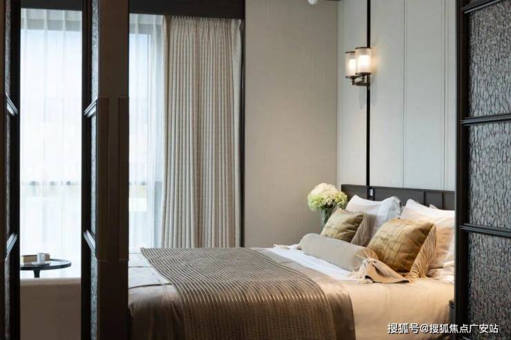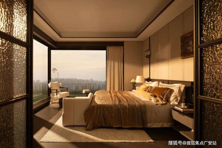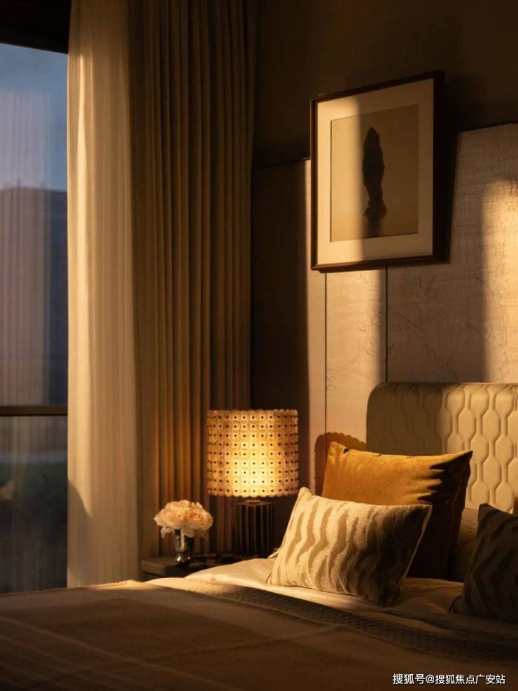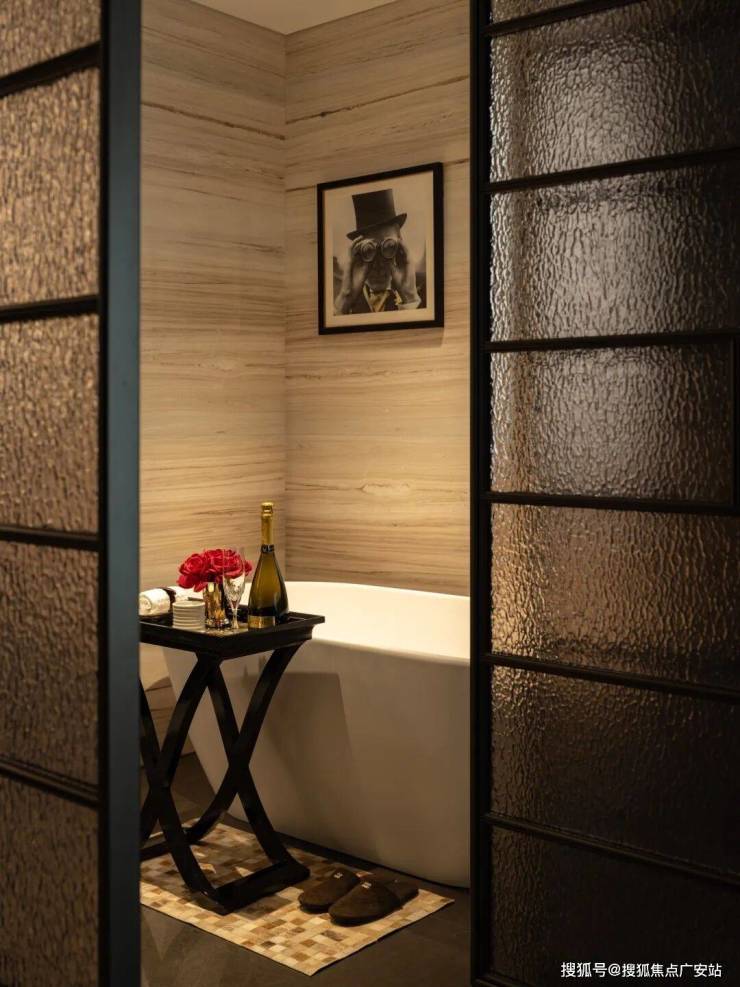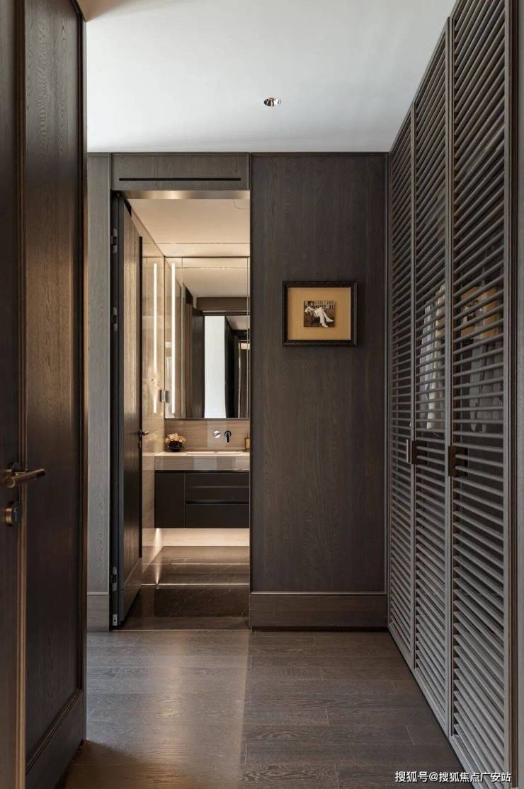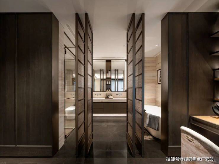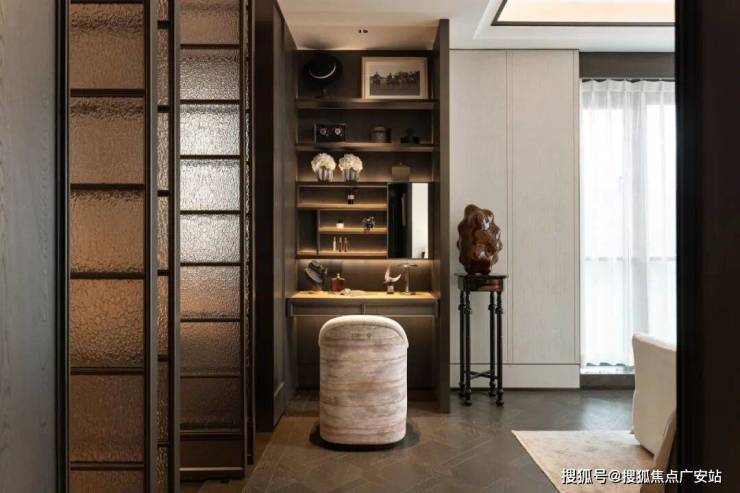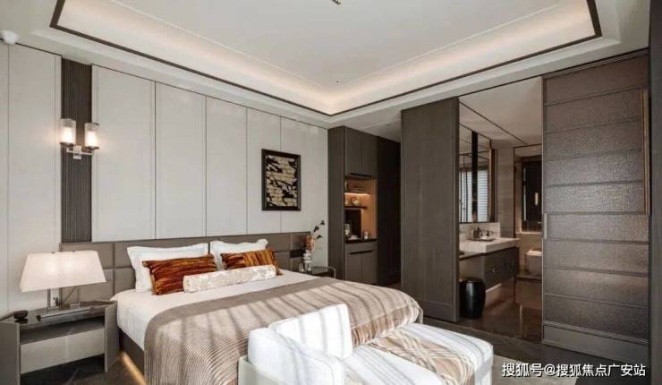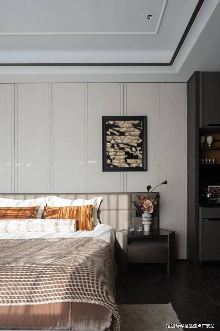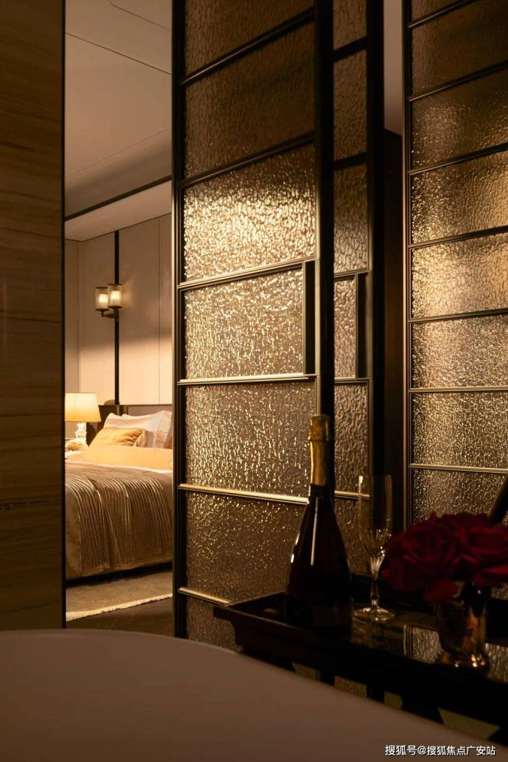 南向主卧套间,以媲美顶奢酒店的尺度,配置衣帽间、迷你吧,成为主人的私域主场。水纹玻璃隔断与客厅设计语言遥相呼应,在层层漫射的光影中,塑造出连贯的空间记忆。