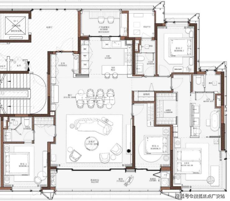 两个户型的风格保持一致,220户型同样为四房配置,并设有双套房,其主卧亦参照星级酒店行政套房标准打造。