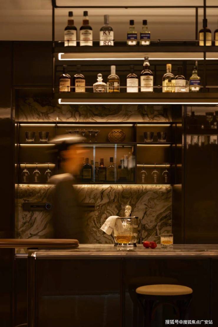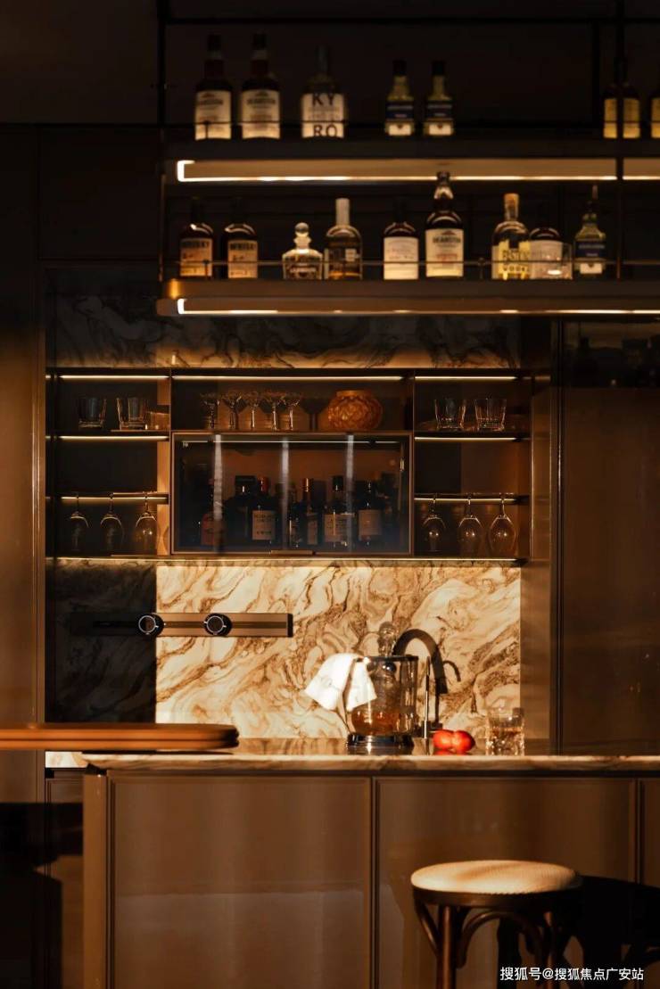 天然石材的精美花纹从外玄关延续到水吧台,与电视剧背景墙相互呼应,以连贯的材质语言完整包裹整个空间。